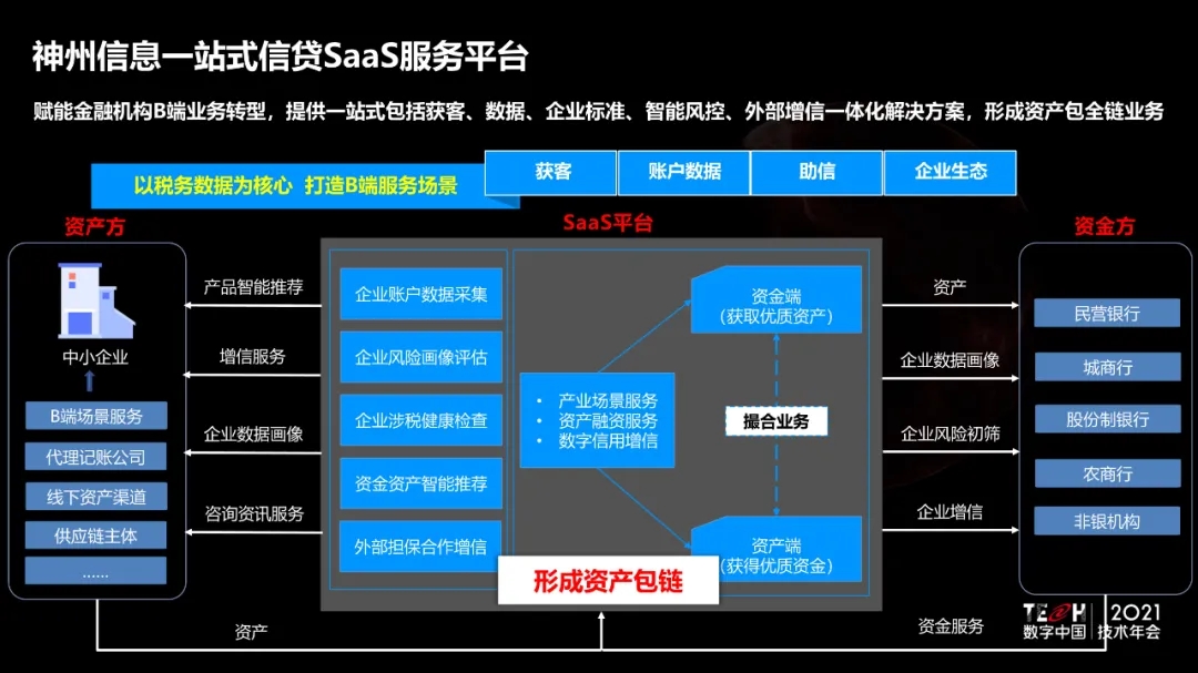 9月29日, TECH数字中国2021技术年会——“场景创新·赋能高质量发展” 主题论坛上,BB贝博艾弗森官网重磅发布自主研发的“一站式信贷SaaS服务平台”。该平台赋能金融机构B端业务转型,提供一站式包括获客、数据、企业标准、智能风控、外部增信一体化解决方案,形成资产包全链业务,为服务实体经济,助推中小微企业新发展提供有力支持。